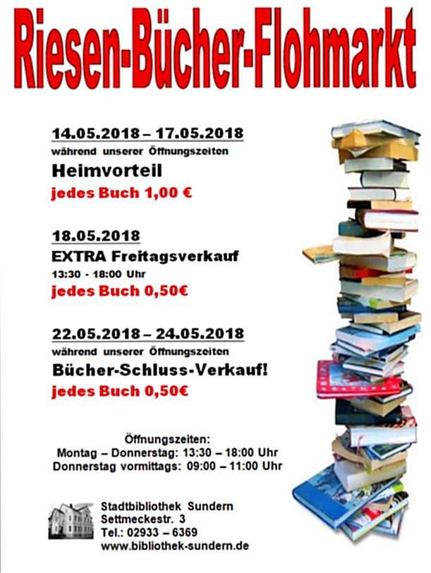Der große Bücherflohmarkt bietet auch Gelegenheit, dauerhaft mit der Stadtbücherei in Verbindung zu bleiben: Am ersten Verkaufstag – am Montag, 14. Mai – erhalten diejenigen Sunderaner, die die Vorzüge einer öffentlichen Bibliothek mit ihrem aktuellen Medienangebot kennenlernen möchten, wieder einen kostenlosen Leseausweis – dieser gilt dann wieder für ein ganzes Jahr.