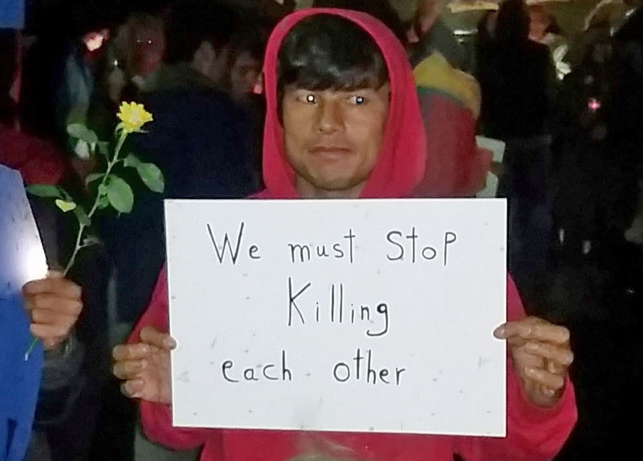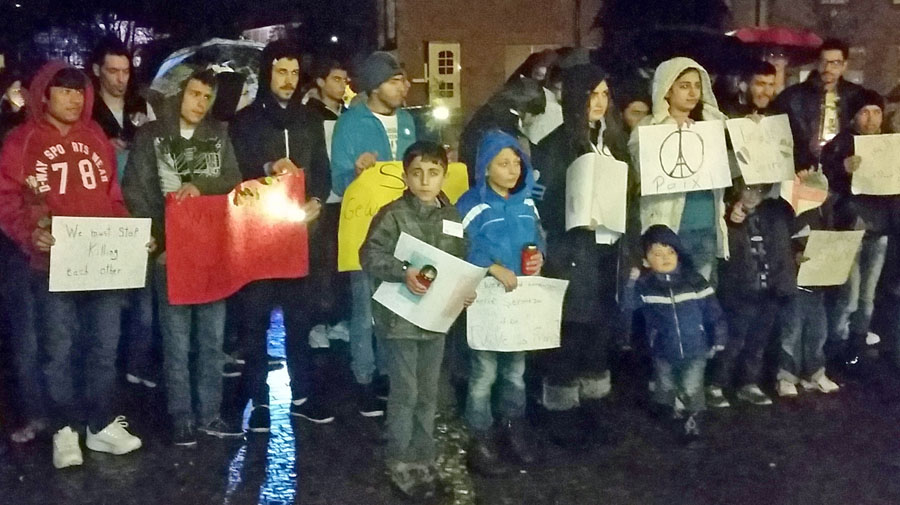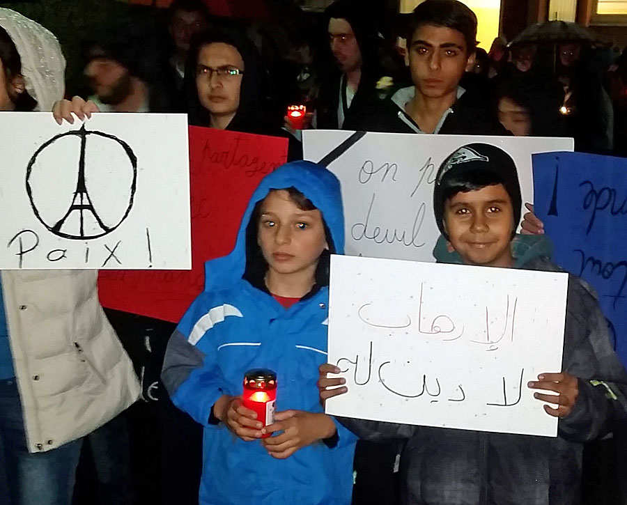 Einige Stunden zuvor hatten sich die Flüchtlinge zu einer spontanen Demonstration für die Opfer der Terroristischen Anschläge von Paris entschlossen und über Facebook ihre Freunde und Unterstützer dazu aufgerufen. So kann es dann am Abend zu einem Kerzenmarsch durch den nasskalten Herbst von der Flüchtlingsunterkunft zur Hl. Geist Kirche in Hüsten. Der Marsch wurde zu einer Demonstration der Hoffnung, an der auch zahlreiche Arnsberger Bürger – unter ihnen Bürgermeister Hans-Josef Vogel – teilnahmen. Die Kinder hatten französische Flaggen gemalt und viele trugen Plakate in verschiedenen Sprachen, mit denen sie Terrorismus und Gewalt verurteilten. Bewegend waren Sätze wie: „Wir sind Muslime und keine Terroristen.“