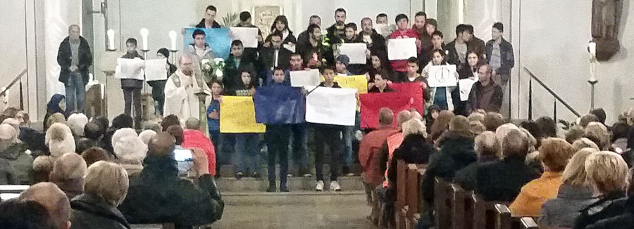 In der Hl. Geist Kirche empfingen die Besucher des Vorabendgottesdienstes die Nachbarn aus der Flüchtlingsunterkunft. Pfarrer Dietmar Röttger begrüßte alle herzlich auch im Namen der katholischen Gemeinde. Er übersetzte die Ansprache Al-Shikhs. Gemeinsam wurde dann für die Opfer von Paris, für Frieden und Freiheit gebetet und gesungen. Am Ende brandete langer Beifall für die spontane Solidaritätsaktion der Flüchtlinge in Arnsberg auf: „Wir alle sind Paris. #JesuisParis.“