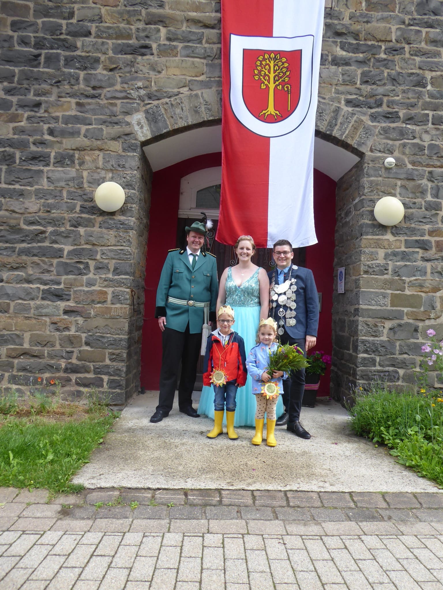 Da die Sommerferien schon begonnen haben, war das Gedränge unter der Vogelstange nicht ganz so groß. Die Schützinnen und Schützen lieferten sich ein großes Gefecht und zielsicher warfen Ben, Leon und Kristian die Flügel und den Schwanz ab. Der Finale Wurf auf den Vogel gelang dann Mia Weber (3 Jahre) die sich Jakob Freiburg zum Mitregenten erwählte. Für den König, der heute Geburtstag hat, war das ein zusätzliches Geschenk. Der Umzug ging anschließend, unter großem Tamtam über den Brückenplatz um die alte Eiche. Nach dem Königstanz konnten sich dann alle mit einem dicken Eis stärken.