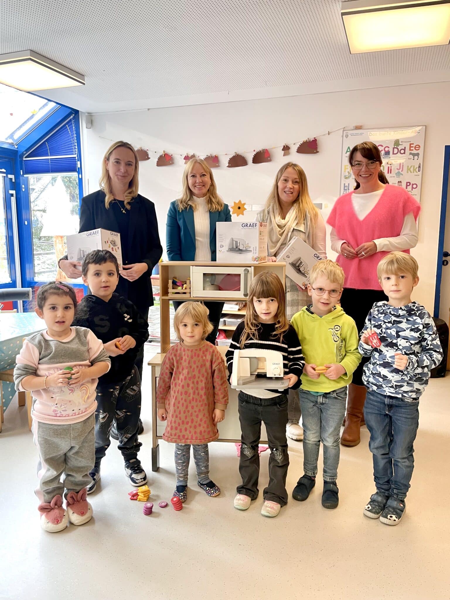 (hin­ten v.l.:) Fran­zis­ka Graef, Mari­on Witt­mann (päd. Fach­be­ra­te­rin der städt. Kitas), Ina Mat­tur­ro (Graef Mar­ke­ting) und Tat­ja­na Sche­fers (Stadt­mar­ke­ting Arns­berg) über­ga­ben die Spiel­zeug­spen­de an die Kin­der der Kita Zip­fel­müt­ze. (Foto: Stadt Arnsberg)