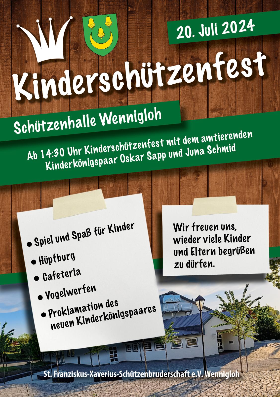 Die kleinen Schützinnen und Schützen des Dorfes treffen sich um 14:30 Uhr an der Schützenhalle. Dort startet dann das Fest mit zahlreichen Aktivitäten, wie z.B. einer Hüpfburg, einer Cafeteria und natürlich dem Vogelwerfen, bei dem die Nachfolger für das amtierende Kinderkönigspaar Oskar Sapp und Juna Schmid ermittelt werden.