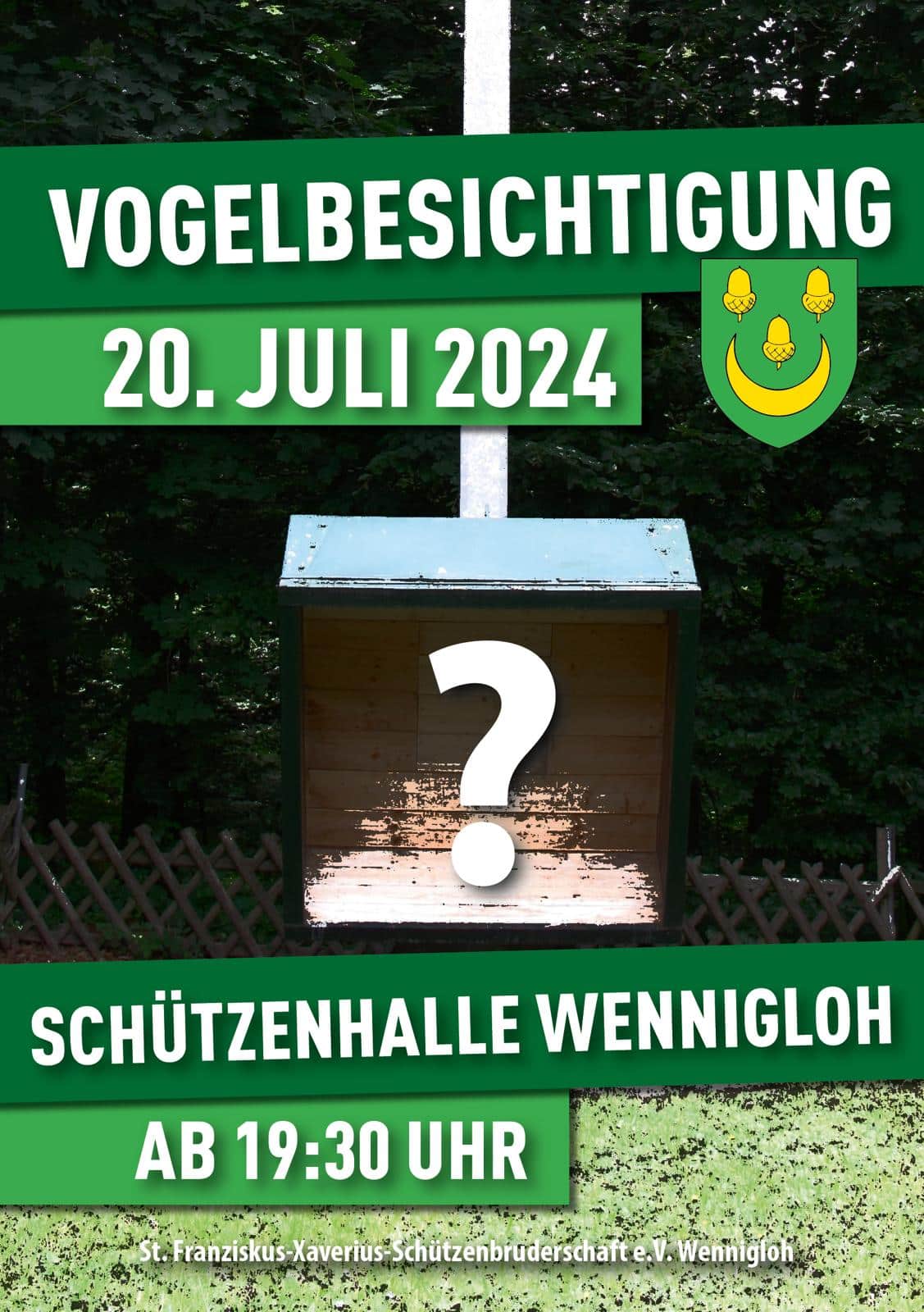 Am Abend werden dann ab 19:30 Uhr die beiden Schützenvögel der gespannten Öffentlichkeit präsentiert. Das Recht zum Bau des Schützenvogels hatte im Frühjahr erneut der Kegelclub „Blaue Jungs“ im Rahmen der Generalversammlung der Wennigloher Schützen für den Rekordpreis von 1.400 Euro ersteigert. Der Bau des Jungschützenvogels obliegt hingegen traditionell dem amtierenden Jungschützenkönig.