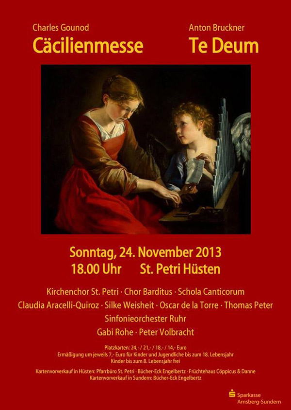 Hüsten. Der Kirchenchor St. Petri Hüsten und der Chor Barditus aus Sundern führen am Sonntag, den 24. November um 18.00 Uhr in der St. Petri Kirche Hüsten die Cäcilienmesse von Charles Gounod und das Te Deum von Anton Bruckner mit den Solisten Claudia Aracelli-Quiroz (Sopran) Silke Weisheit (Alt) Oscar de la Torre (Tenor) Thomas Peter (Bass) und dem Sinfonieorchester Ruhr auf.