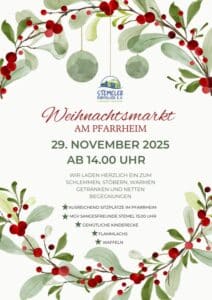Sundern/Stemel. Der Ver­ein „Ste­me­l­er Dorf­glück“ lädt am kom­men­den Sams­tag, den 29. Novem­ber 2025 zum Weih­nachts­markt am Pfarr­heim ein. Beginn ist um 14 Uhr. Es wird zum Schlem­men, Stö­bern, war­men und kal­ten Geträn­ken sowie zu net­ten Begeg­nun­gen ein­ge­la­den. Für „Frost­beu­len“ ist auch das weih­nacht­lich geschmück­te Pfarr­heim geöff­net, wo auch eine Kin­der­ecke ein­ge­rich­tet wird.