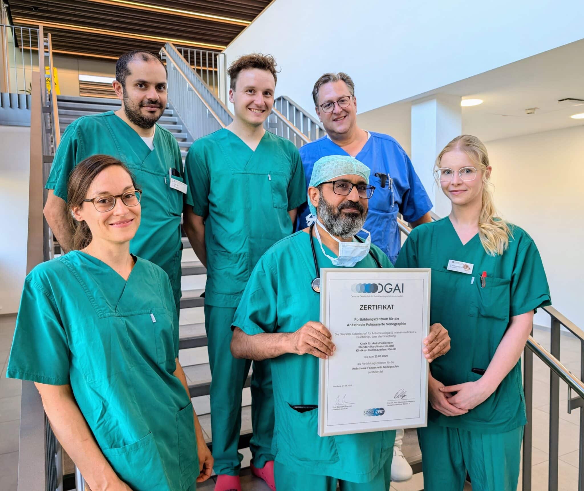 Arnsberg/Hüsten. Der zielgenaue Einsatz der Sonografie ist zu einem wichtigen Bestandteil bei der Diagnose und Therapie vielfältiger Erkrankungen geworden, deren praktische Anwendungsmöglichkeiten u.a. in Narkoseverfahren sowie in der Schmerztherapie liegen. Dies setzt fachspezifische Kenntnisse und Erfahrung voraus, die in speziellen Schulungen erlernt werden müssen. Die Klinik für Anästhesiologie am Klinikum Hochsauerland ist jetzt als eine von wenigen Kliniken in Deutschland von der Deutschen Gesellschaft für Anästhesiologie und Intensivmedizin (DGAI) als Ausbildungszentrum für die Sonographie in der Anästhesiologie und sein strukturiertes Ausbildungsprogramm mit dem Qualitätssiegel SONO-ZERT ausgezeichnet worden. Deutschlandweit können aktuell nur 14 Klinikum ein solches Zertifikat vorweisen.