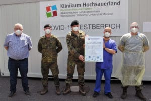 Werner Kemper, Sprecher der Geschäftsführung des Klinikums Hochsauerland zeigte sich beeindruckt von der hervorragenden Unterstützungsleistungen und der ausgezeichneten Zusammenarbeit mit den „Helfern in Uniform“ und sprach den Soldatinnen und Soldaten für die tatkräftige und großartige Leistung den besonderen Dank und Anerkennung des Klinikums aus. Markus Bieker, Geschäftsführer der Klinikum Hochsauerland Infrastruktur GmbH, überreichte im Rahmen einer kleinen Verabschiedung eine Dankurkunde. Stellvertretend für die Soldatinnen und Soldaten der 4. und der 1. Kompanie des Aufklärungsbataillons 7 aus Ahlen nahm der Chef der 1. Kompanie, Herr Major Baron von Düsterloh, den Dank entgegen. „Der Dank des Klinikums gilt neben dem Aufklärungsbataillon 7 ausdrücklich auch dem Kommando für Territoriale Aufgaben der Bundeswehr in Berlin unter der Führung von Herrn Generalmajor Karsten Breuer sowie den nachgeordneten Dienststellen für die oftmals schnelle und unbürokratische Hilfe bei Genehmigung der sog. Hilfeleistungsanträge , ebenso dem Hochsauerlandkreis für die Bearbeitung der Anträge“, sagte Markus Bieker.