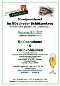 Anmel­dun­gen zum Grün­kohl­es­sen bis zum 03.01.25 bei Tho­mas Rasche unter Rasche-thomas@t‑online.de oder unter 0171 8719906.