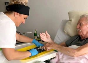 Alle Zutaten wurden in die mobile Küche eingeräumt und ins Zimmer gebracht. Herr P. war sehr erfreut. Gemeinsam wurden alle Zutaten vorbreitet. Mit Unterstützung von Fatima schnitt Herr P. die Zwiebel klein, dünstete sie im Topf an und dann kamen der Spinat und die Gewürze dazu. Seine Freude darüber wieder selbst etwas tun zu können, konnte man ihm am Gesicht ablesen. Sehr konzentriert wendete er die Fischstäbchen in der Pfanne, während Fatima das Püree zubereitete. Nachdem sie gemeinsam das Gericht fertiggestellt hatten, sah man an der Mimik und Gestik von Herrn P. wie ihm das „selbst zubereitete“ Essen schmeckte. Durch dieses tolle Ereignis war Herr P. emotional sehr ergriffen und es kamen ihm die Tränen.