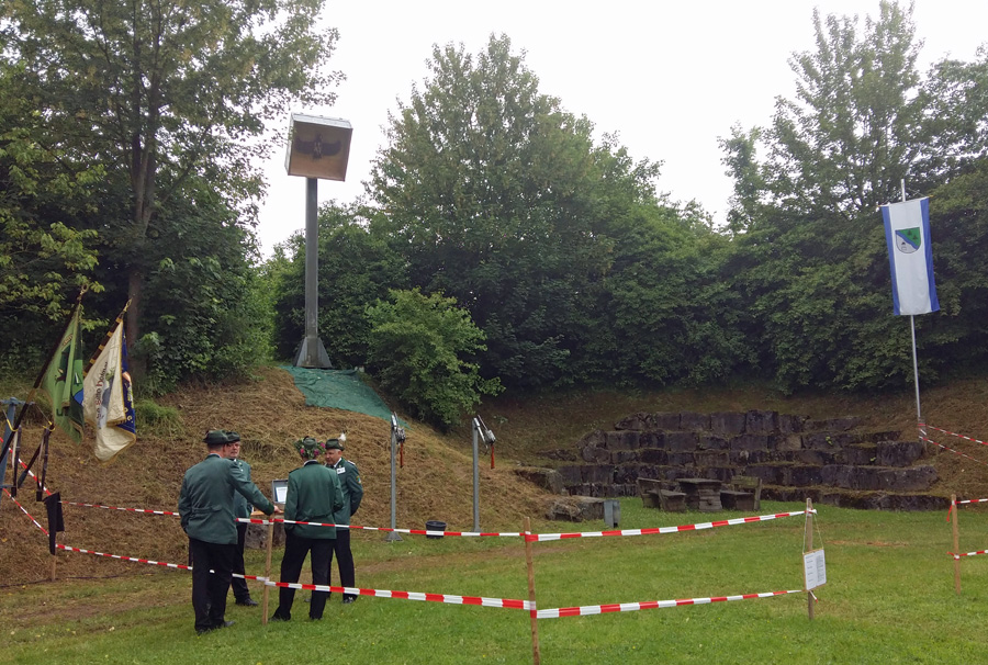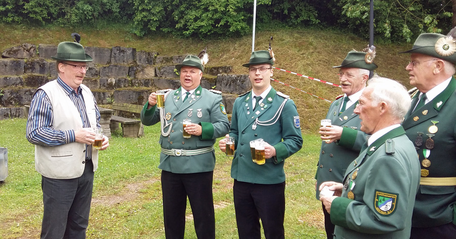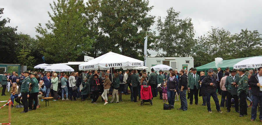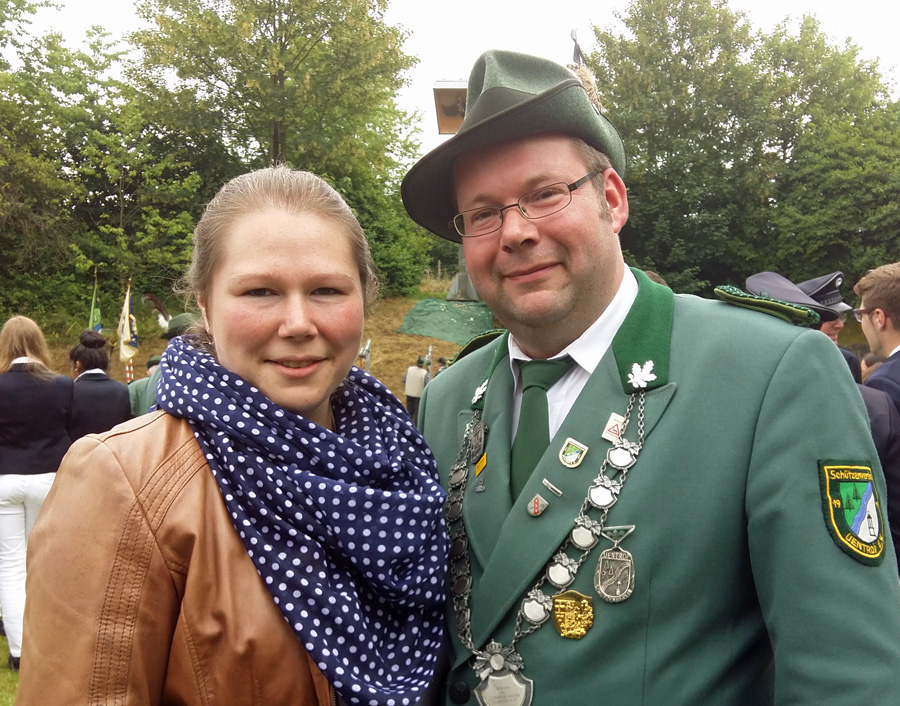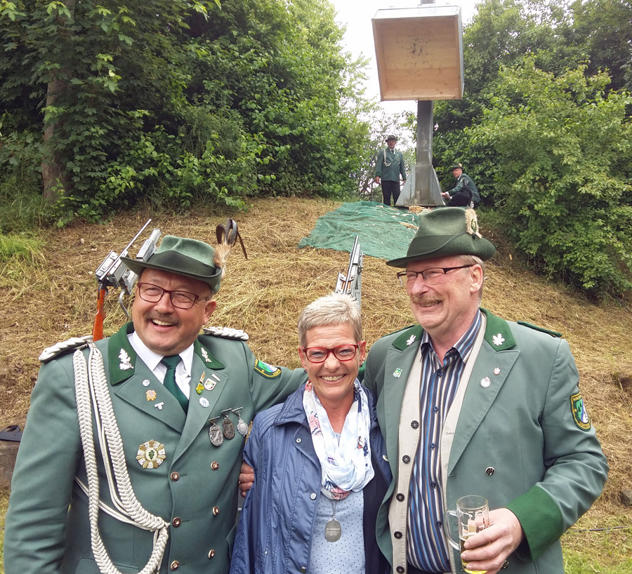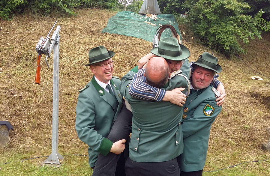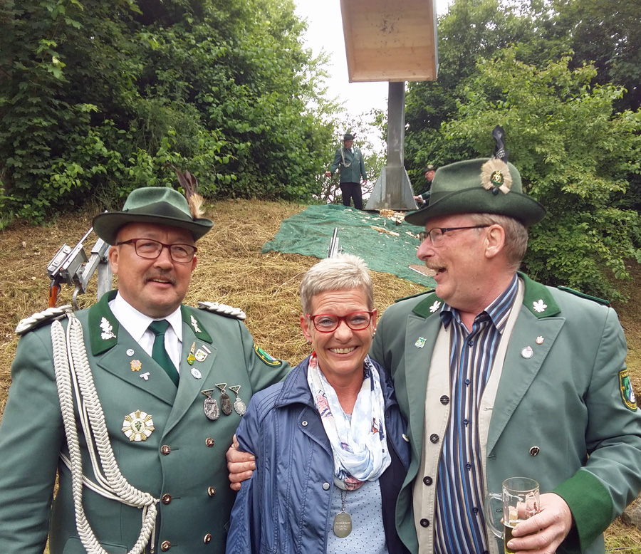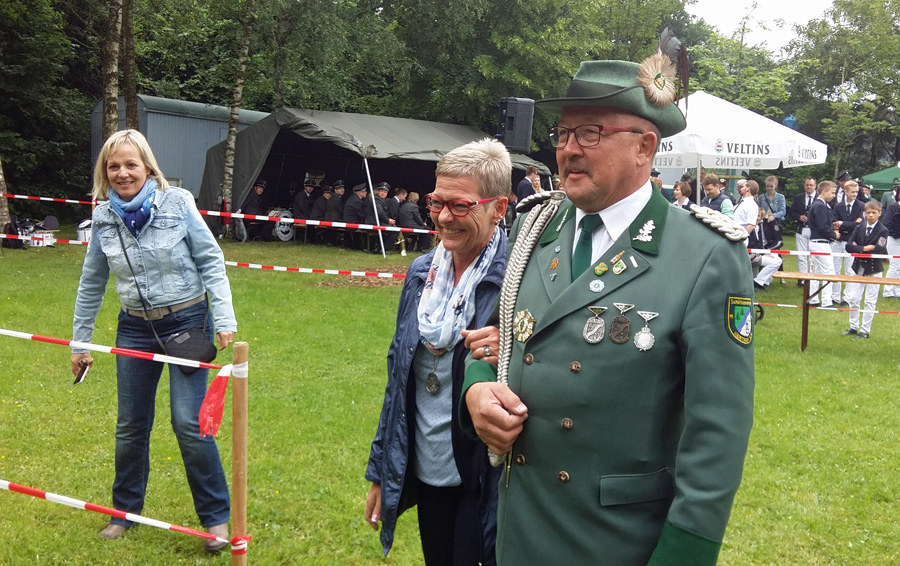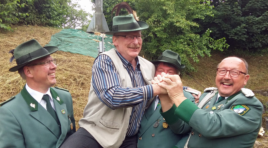 Zum Mikrofon musste Hochstein dann aber doch nicht greifen. Hans Cosack, der beim Aufstehen noch nichts von seinem Glück geahnt hatte und nur instinktiv eine schwarze Hose angezogen hatte, lieh sich vom Hauptmann den Schützenhut und ging unter die Stange. Der Vogel war schnell gerupft, um 13.08 Uhr flog der letzte Span in die Tiefe. Der 63-jährige selbständige Kaufmann, der auf der Glösinger Straße einen Wildhandel betreibt, konnte jubeln. Der neue König ist zwar Oeventroper, aber Mitglied der Uentroper Schützen, denn seine Frau Andrea stammt aus der alten Uentroper Schützendynastie Drepper. Sie war bereits 1983/84 Uentroper Königin und auch Uentroper Kaiserin im 100-jährigen Jubiläumsjahr.