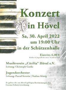 Sundern/Hövel. Der Musikverein Cäcilia Hövel freut sich, nach zwei Jahren coronabedingter Pause, endlich wieder ein Frühjahrskonzert am 30.04.2022 um 19:00 Uhr in der Höveler Schützenhalle veranstalten zu können. Dieses Jahr gibt es ein Querschnitt verschiedenster Musikrichtungen. So werden die Liebhaber von traditioneller Blasmusik wie Marsch, Walzer und Polka ebenso auf ihre Kosten kommen wie die Freunde von Film- und Musicalmelodien.