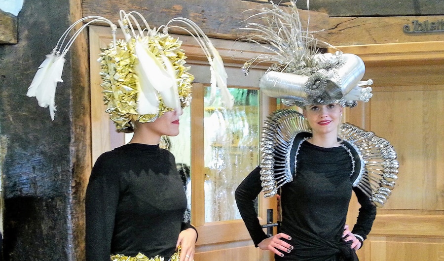 Seit über 30 Jahren fertigt Gisela Schlotmann Hutkreationen aus außergewöhnlichen Materialien an und konnte damit schon bei vielen Veranstaltungen überzeugen. Ausschließlich recycelten Materialien, wie beispielsweise Silikontüllen, Eierkartons, Obst- und Gemüsenetze, Verpackungen allgemein, Bierdeckel, alte Tennisbälle und vieles andere, kommt bei den individuellen Hutkreationen zum Einsatz. Viele neue Kreationen, fantastische Hüte, überwiegend aus Verpackungsmaterialien hergestellt, handwerklich geschickt mit Rohstoffen und Recyclingstücken aus Fertigungsprozessen kombiniert, fanden den Beifall der zahlreichen Besucher.