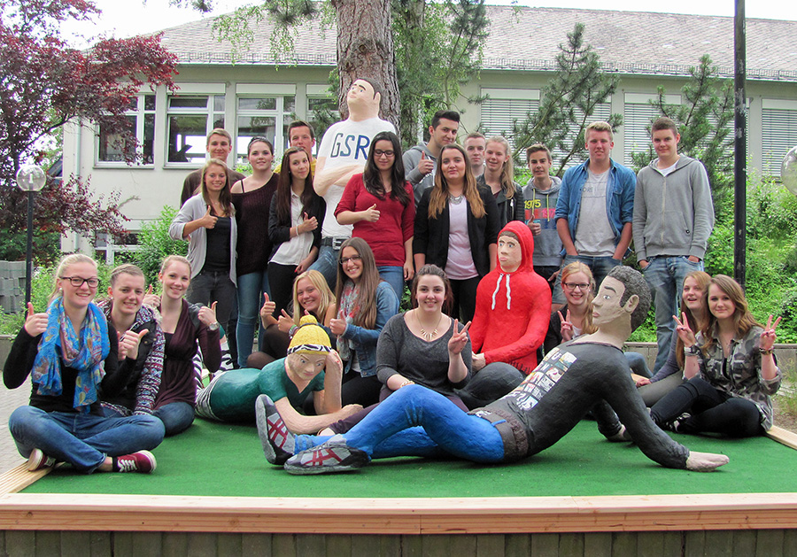 Angefertigt wurden sie durch 29 Schülerinnen und Schüler des Kunstkurses der Jahrgangsstufe 11. Die lebensgroßen Figuren wurden mit Drahtgeflecht vom lebenden Modell abgenommen, verdrahtet, mit Papierkügelchen fest ausgestopft, mit Kartoffelsäcken eingenäht und dann mit mehreren dünnen Schichten Beton ummantelt. Nach der Feinmodellierung von Details, wie Faltenwurf und Gürtelschnallen konnten die Figuren lebensecht mit Fassadenfarbe bemalt werden. „So wirkt der Schulhof deutlich belebter und so mancher Betrachter hat die Kunstobjekte schon mit den lebenden Modellen verwechselt,“ freut sich Bettina Janßen von der Fachschaft Kunst.