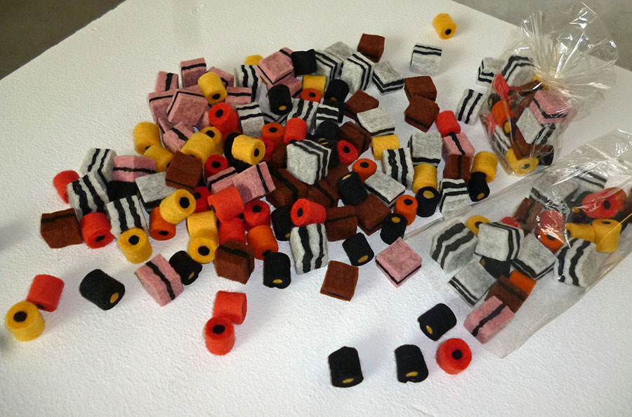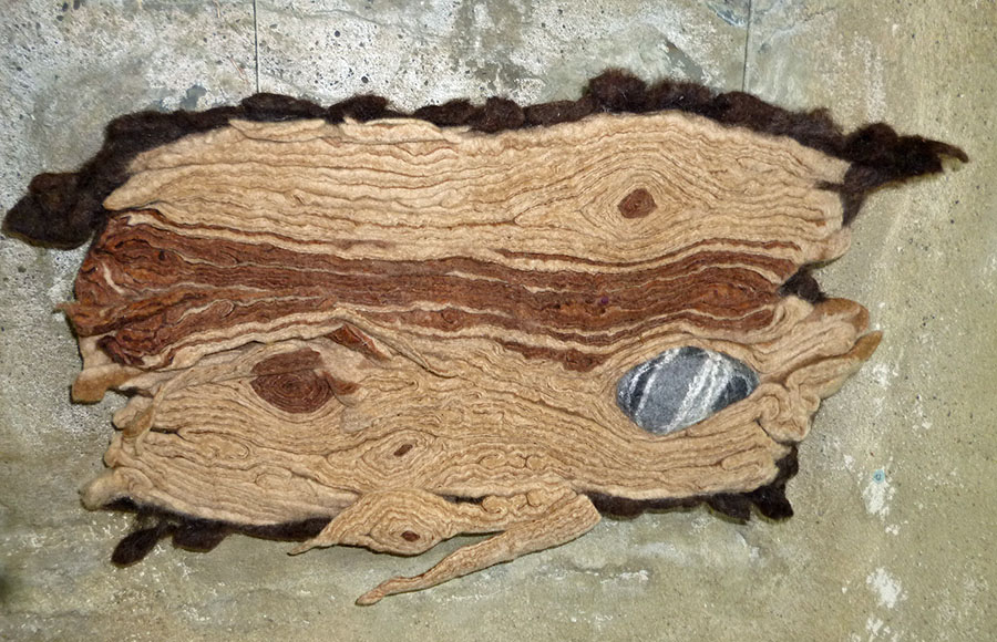 Beate Bossert arbeitet seit 25 Jahren mit Filz. Das Rumarbeiten ist für die immer noch ein totaler Genuss und ihr fällt auch immer noch etwas Neues ein. Kieselsteine fertigt sie als Auftragsarbeit in allen gewünschten Farben und Maserungen nach Fotos und Vorlagen, für den Kunstmäzen Würth hat sie in ihrer Heimat Baden-Württemberg sogar Schrauben gefilzt. Das Geheimnis sind die unterschiedlichen Wollsorten von über 100 Schafrassen und die Farben, die sie sich wie beim Malen teils selber mischen muss. Das Filzen ist dann kein chemischer Prozess, sondern reine Mechanik. Die losen Haare werden nach jahrhundertealten Techniken nur mit Feuchtigkeit und Reibung bearbeitet. Die Zugabe von Seife ist möglich und beschleunigt den Prozess, es geht aber auch ohne Seife. Der Filz wird erst in der Hand aus den Wollhaaren gelegt, später regelrecht getreten und zusammengestampft. Bei ihren Kieselsteinen liege der Schwund an Masse bei 50 bis 60 Prozent, erläutert die Künstlerin, bei Wandteppichen immerhin auch bei 10 bis 20 Prozent.