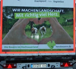 Hochsauerlandkreis. „Wir machen Landschaft – Die Bauern im Hochsauerlandkreis“ steht auf Großplakaten, die auf den Hecktüren von fünf Lastwagen aus dem Sauerland durch ganz Europa fahren. „Wir machen Landwirtschaft – mit richtig viel Herz!“ – ist der Leitspruch der neuen Kampagne des Westfälischen Landwirtschaftsverbandes (WLV). Der Landwirtschaftliche Kreisverband Hochsauerland leistet mit zwei eigenen Motiven seinen Beitrag zu dieser landesweiten Aktion. Erkennungszeichen der Kampagne sind zwei Hände, die ein großes Herz formen – und damit gleich die Form von Westfalen-Lippe auf der Landkarte aufnehmen.
