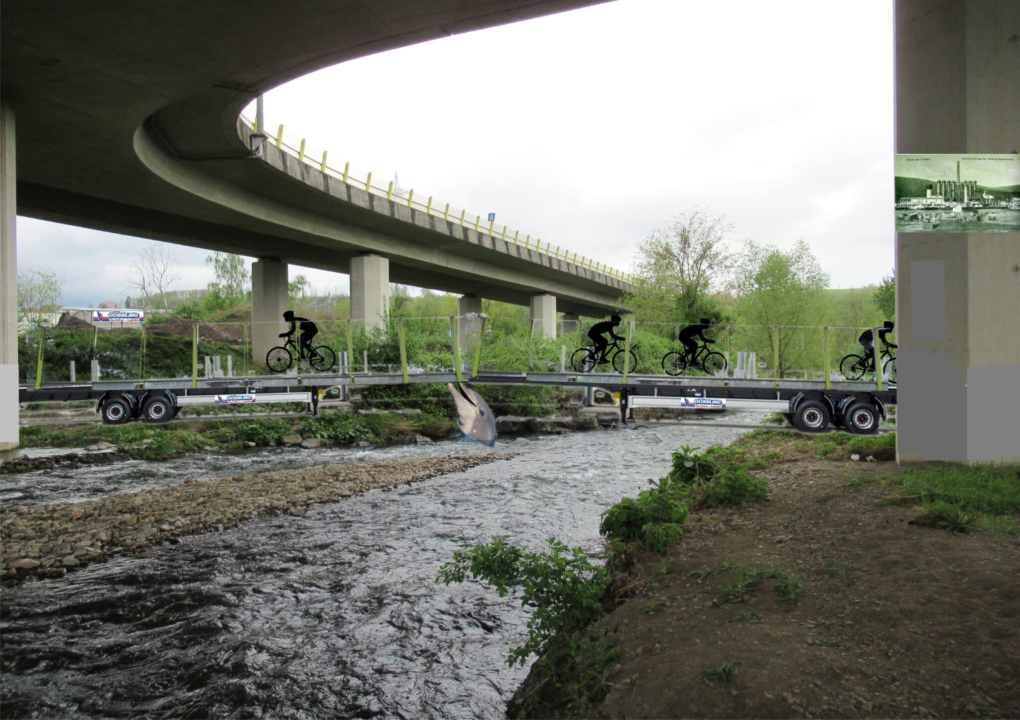 Hier kommt die Idee einer kostengünstigen Röhr-Querung zum Tragen: Wie in der Foto-Animation beispielsweise dargestellt, werden zwei ausgemusterte Plateau-Sattelauflieger über die Röhr gelegt. Getragen und abgestützt werden diese durch eine Spundwandsäule, verkleidet durch „tragende“ Cortenstahl-Delphine. Kunst im Fluss also, die m.E. eine Genehmigung wesentlich vereinfacht. (Bessere Ideen sind hier willkommen.)