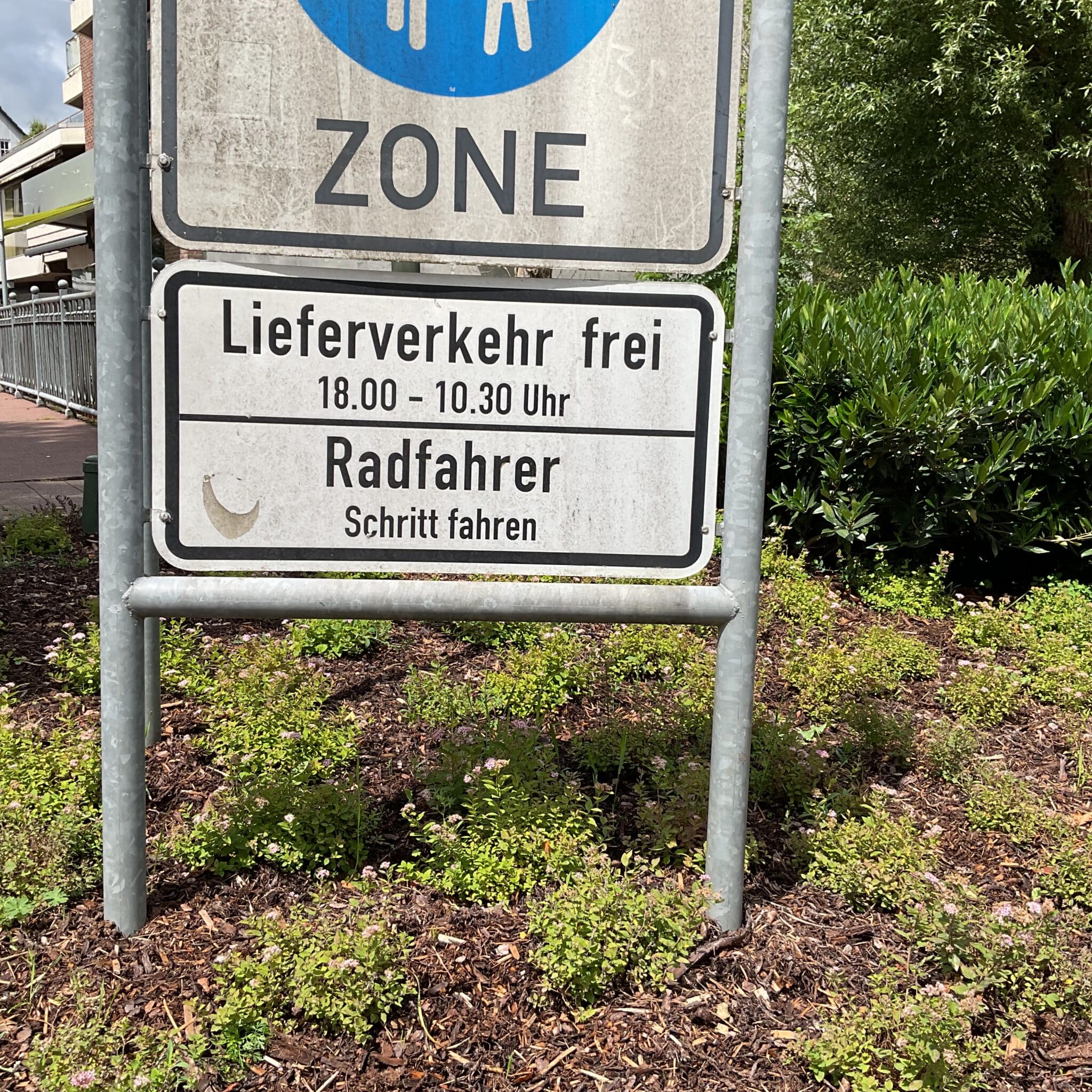 Das Schild eingangs der Fußgängerzone weist aus „Lieferverkehr frei“. Dies gilt nur für die Belieferung mit Waren und Transporte von Gegenständen, die für die Führung und Aufrechterhaltung eines Geschäfts- oder Gewerbebetriebes erforderlich sind. Dies gilt zwischen 18:00 Uhr abends und 10:30 Uhr morgens. Ausgenommen sind Einsatz‑, Rettungs‑, Entsorgungs- oder Straßenreinigungsfahrzeuge – ebenso donnerstags die Händlerinnen und Händler des Wochenmarktes zum Auf- und Abbau der Stände. Taxen dürfen die Fußgängerzone jedoch nicht befahren. Für Privatpersonen gilt: Auto auf den öffentlichen Parkflächen abstellen und zu Fuß in die Innenstadt gehen.