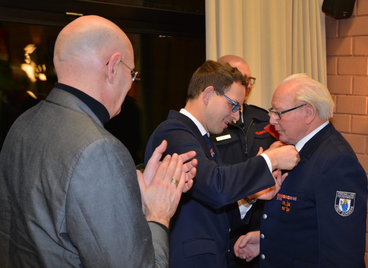 Zum Ende der Versammlung folgte der eigentliche Höhepunkt der Veranstaltung: Johannes Vollmer, Ehrenstadtbrandmeister der Feuerwehr Sundern, wurde für seine 70-jährige Mitgliedschaft in der Feuerwehr mit der Ehrennadel in Gold ausgezeichnet. Wehrführer Frank Siedhoff überreichte die seltene Auszeichnung. Der 90-jährige Johannes Vollmer trat im Jahr 1948 in die Freiwillige Feuerwehr der Gemeinde Sundern ein. In der Zeit von 1952 bis zur kommunalen Neugliederung war er als Gemeinde- bzw. Amtsbrandmeister tätigt, danach von 1975 bis 1988 als Stadtbrandmeister der Feuerwehr Stadt Sundern. In dieser Amtszeit hat sich Vollmer in einem hohen Maße für die Belange der Feuerwehr Sundern eingesetzt. Seit dem Jahr 1988 gehört Johannes Vollmer mit Erreichen der Altersgrenze der Ehrenabteilung der Feuerwehr Sundern an.
