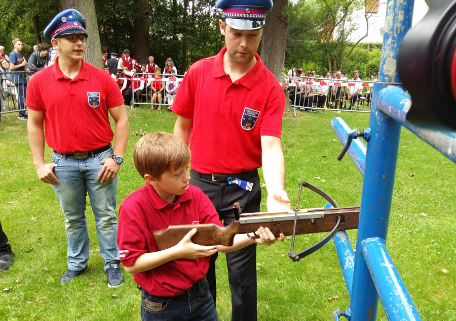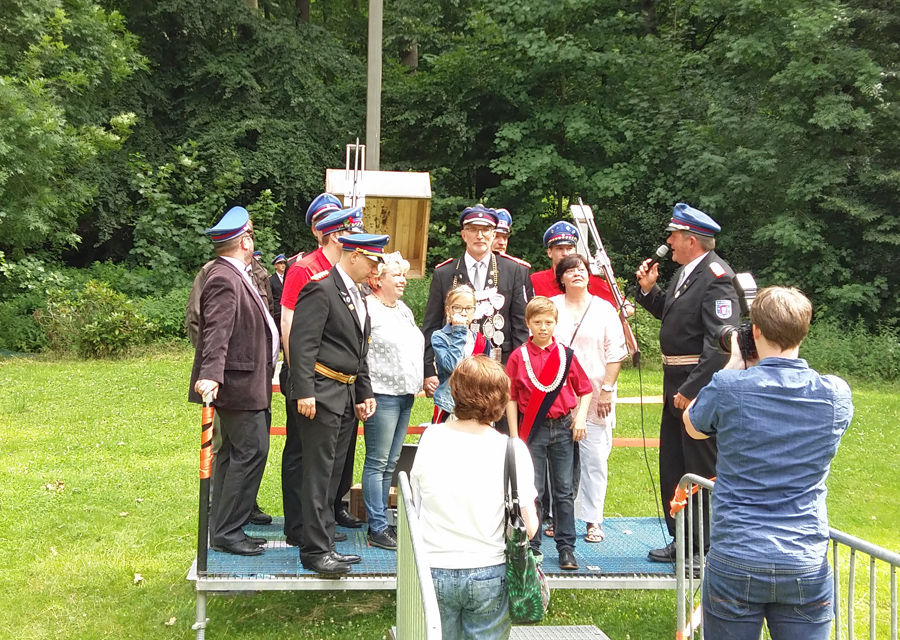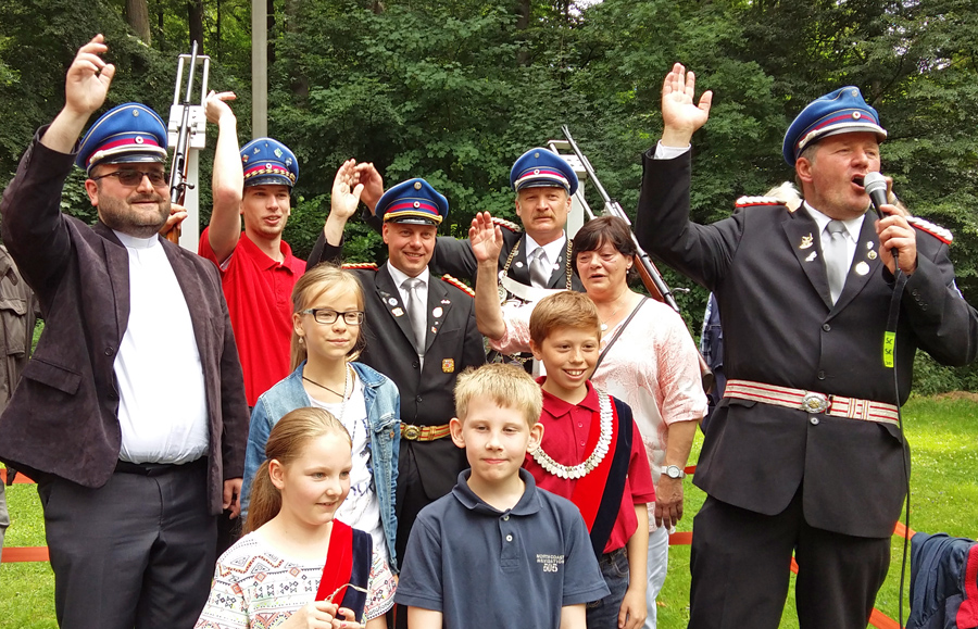 Wesent­lich schnel­ler ging es zuvor bei den Jung­schüt­zen. Hier jubel­te Ste­phan Dei­mel bereits nach dem 85. Schuss. Der 23-jäh­ri­ge Sohn des neu­en Königs, der in Würz­burg Bio­lo­gie stu­diert, hat bereits Regent­schafts­er­fah­rung, denn 2003 wur­de er Kin­der­kö­nig. Die­se Wür­de sicher­te sich in die­sem Jahr der neun­jäh­ri­ge Tammo Jänsch, der an die­sem Schüt­zen­fest­mon­tag auch erst­mals um 6 Uhr mor­gens mit dem Tam­bour­corps mit­mar­schiert ist, wie sei­ne Mut­ter stolz berich­te­te. Als Kin­der­kö­ni­gin wird Tammo die zehn­jäh­ri­ge Maria Brink­schul­te zur Sei­te stehen.