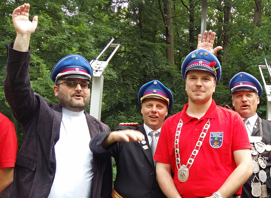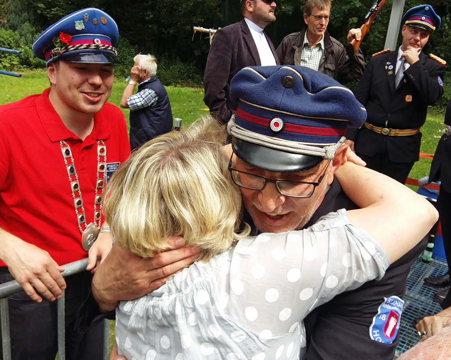 Mar­tin Dei­mel hat­te sich viel vor­ge­nom­men unter der Vogel­stan­ge. Schließ­lich ist sei­ne Fami­lie nach­weis­lich seit 1466 in Hol­zen ansäs­sig. Und das sind in die­sem Jahr genau 550 Jah­re. Ein guter Anlass für einen Königs­schuss, zumal aus­ge­rech­net in die­sem Jahr auch Ehe­frau Maria exakt an Schüt­zen­fest­mon­tag Geburts­tag hat. Dem­entspre­chend groß war auch die Freu­de bei dem 54-jäh­ri­gen neu­en König, der bei Lüb­ke & Vogt in Sun­dern arbei­tet und im Holze­ner Schüt­zen­vor­stand für die rote Fah­ne ver­ant­wort­lich ist. Mit dem 166. Schuss hol­te er den Vogel von der Stange.