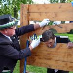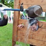 Nach dem Schießen ging es ans Taufen. Auf dem wunderbar bespielbaren Geläuf stand der Pranger, wo die Vollstrecker ihres Amtes walteten und zahlreichen Jungjägern und auch Jungjägerinnen mit einem reichlichen Guss aufs Haupt nachhaltig ihr Versprechen, auf immer ein strammer und trinkfester Jäger zu sein, in die Erinnerung einprägten. Auch die amtierende Königin Susanne Webers und Vorstandsmitglied Christof Hesse sind der Taufe nicht entkommen.