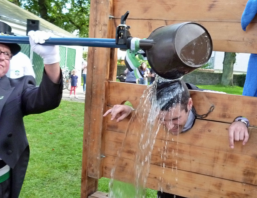 Nach dem Schie­ßen ging es ans Tau­fen. Auf dem wun­der­bar bespiel­ba­ren Geläuf stand der Pran­ger, wo die Voll­stre­cker ihres Amtes wal­te­ten und zahl­rei­chen Jung­jä­gern und auch Jung­jä­ge­rin­nen mit einem reich­li­chen Guss aufs Haupt nach­hal­tig ihr Ver­spre­chen, auf immer ein stram­mer und trink­fes­ter Jäger zu sein, in die Erin­ne­rung ein­präg­ten. Auch die amtie­ren­de Köni­gin Susan­ne Webers und Vor­stands­mit­glied Chris­tof Hes­se sind der Tau­fe nicht entkommen.