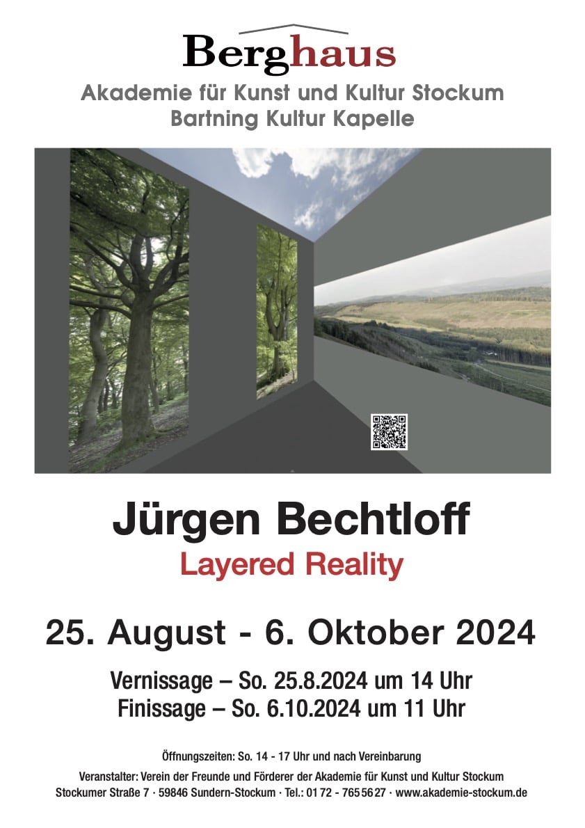 Nach einer kleinen Pause können dann die Interessierten um 14 Uhr die Vernissage der Ausstellung „Layered Reality“ von Jürgen Bechtloff besuchen, organisiert von dem Verein der Freunde und Förderer der Akademie für Kunst und Kultur Berghaus Stockum.
