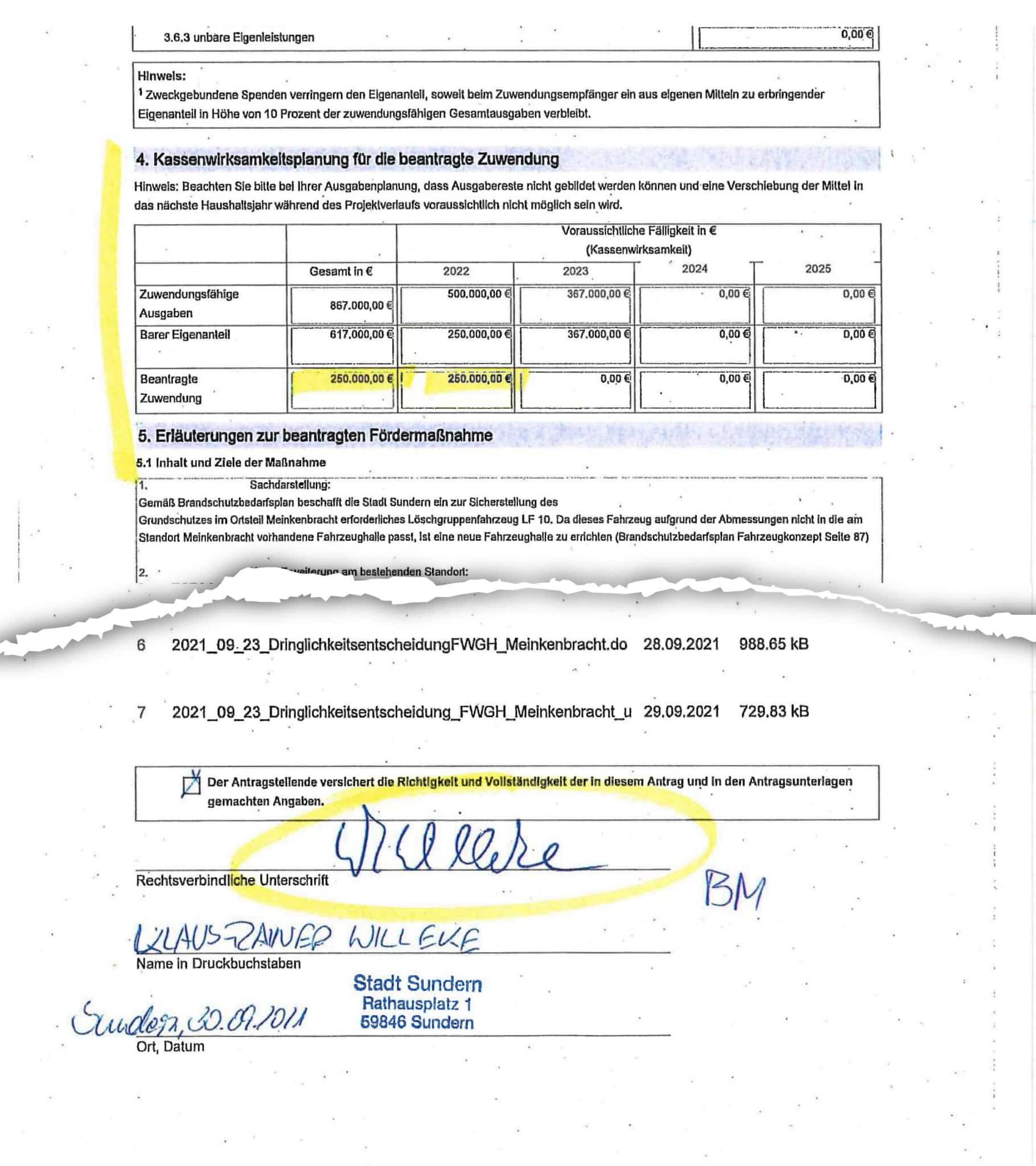 Diese Zahlung wurde mit Förderbescheid vom 2. Juni 2022 bewilligt. Herr Bürgermeister hat – wie sie dem Antrag entnehmen können – keine Aufteilung der beantragten Fördersumme auf die Haushaltsjahre vorgenommen. Daraus ist für die Förderbehörde ersichtlich, dass die Stadt Sundern, sofern sie in das Förderprogramm aufgenommen wird, die Finanzmittel im Jahr 2022 erhalten möchte. Unabhängig vom Erhalt des Zuwendungsbescheids haben die Antragsteller durch die in der Programmveröffentlichung veröffentlichten Ausnahme des vorzeitigen Maßnahmebeginns für die Maßnahmen des Landesprogrammes ‚Feuerwehrgerätehäuser 2022‘ das Recht, direkt mit der Umsetzung zu beginnen. Sprich: Die Finanzmittel wurden so bewilligt, wie der Bürgermeister diese beantragt hat. Hinweislich: Der Rechtsanspruch auf die Förderung erlischt auch nach Ablauf des Jahres 2022 nicht.