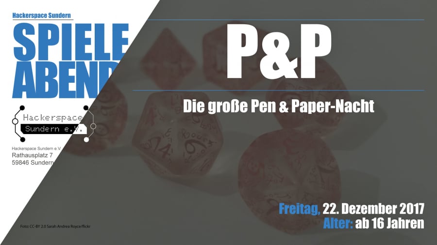 „Todesmutig stürzen sich die Mitglieder des Hackerspace Sundern e.V. in dieses Abenteuer und laden herzlich ein, sie dabei zu begleiten“, so Florian Otto vom Hackerspace. „Nur bewaffnet mit Stift, Papier und Würfeln werden unsere Helden sich aufmachen um die Welt zu retten.“ Ein Pen-&-Paper-Rollenspiel – englisch für „Stift und Papier ‑ist ein Spiel, bei dem die Mitwirkenden fiktive Rollen einnehmen und gemeinsam durch Erzählen ein Abenteuer erleben. Als Hauptspielmittel werden die namensgebenden Stifte und Papier eingesetzt, um die dargestellten Rollen auf Charakterbögen zu beschreiben und Notizen zum Spielverlauf zu machen.
