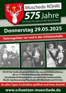 Das Fest startet am Donnerstag, 29. Mai 2025, um 9.30 Uhr mit einem Festhochamt in der St. Hubertus-Kirche in Müschede, in dem auch die neuen Fahnen der Bruderschaft feierlich geweiht werden. Um 11.00 Uhr beginnt das Schießen um die Würde des Jubeljugendkönigs, bei dem alle bisherigen Jugendkönige auf dem Vorplatz der Feuerwehr gegeneinander antreten. Nach der Proklamation findet das Jubelkönigsschießen an gleicher Stelle statt, bei dem alle noch lebenden Schützenkönige der Bruderschaft um die Würde des Jubelkönigs wettstreiten. Anschließend findet vor und in der Schützenhalle eine zünftige Vatertagsfeier statt, zu der auch Gäste aus nah und fern eingeladen sind. Die musikalische Untermalung erfolgt durch den Spielmannszug Müschede, den Musikverein Hachen, den Musikverein Müschede und DJ Fabi.