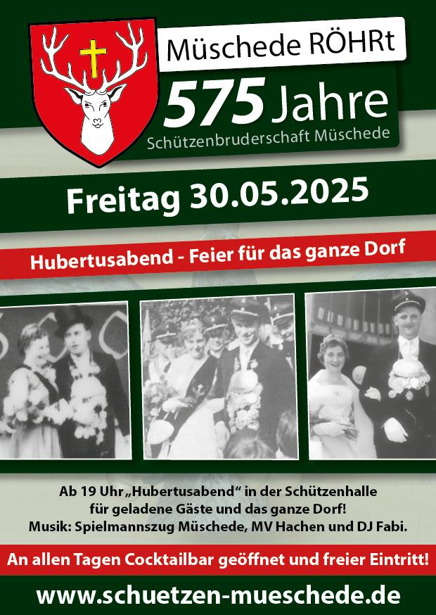 Am Freitag, 30. Mai 2025, beginnt um 19.00 Uhr der Hubertusabend, eine Feier für das gesamte Dorf. Dazu werden die ehemaligen Königspaare in die Schützenhalle einmarschieren. Auch weitere Ehrengäste sind geladen. Die musikalische Untermalung erfolgt auch hier wieder durch den Spielmannszug Müschede, den Musikverein Müschede und DJ Fabi.