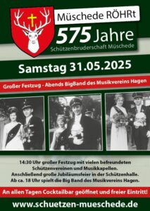 Am Samstag, 31. Mai 2025, startet um 14.30 Uhr der große Festzug durch das Dorf. Hierzu werden befreundete Gastvereine und Musikkapellen mit über 1.000 Personen von der Fa. Cronenberg durch die Müscheder Straßen bis zur Schützenhalle marschieren. Auf Höhe der Feuerwehr werden u. a. die Ehrengäste und die ehemaligen Königspaare den Festzug passieren lassen. Es schließt sich die große Jubiläumsfeier in der Schützenhalle an. Ab 18.00 Uhr spielt die BigBand des Musikvereins Hagen auf.