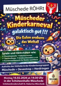 In die­sem Jahr steht die Ver­an­stal­tung unter dem Mot­to: „Müsche­der Kin­der­kar­ne­val galak­tisch gut – Die Eulen erobern das Welt­all!“. Das Mot­to bie­tet reich­lich Raum für Fan­ta­sie und ver­spricht aus­ge­fal­le­ne Kos­tü­me rund um Pla­ne­ten, Ster­ne, Astro­nau­ten und ande­re galak­ti­sche Figuren.