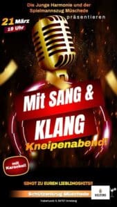 Arnsberg/Müschede. Am Sams­tag, den 21. März, lädt ein beson­de­res musi­ka­li­sches Event in den Schüt­zen­krug Müsche­de ein: Der Spiel­manns­zug Müsche­de und die Jun­ge Har­mo­nie ver­an­stal­ten gemein­sam einen Karao­ke-Abend. Beginn ist um 19 Uhr.