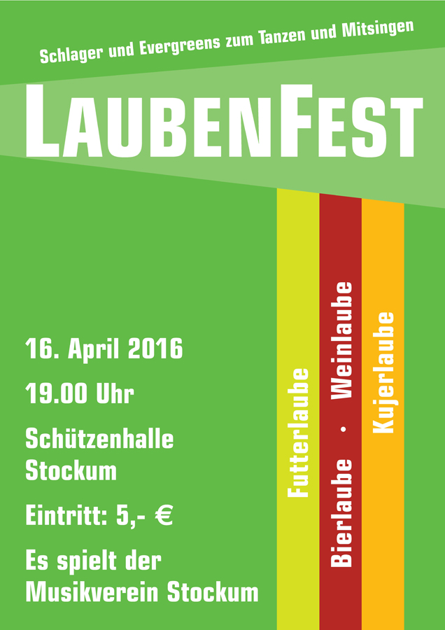 Musikalisch wird ein buntes Programm der Stockumer Musikanten geboten. Nach leichter Unterhaltungsmusik zu Beginn gibt es zu späterer Stunde bekannte und neue Stücke der Stockumer Tanzmusik zum Feiern, Tanzen und Mitsingen. Die Gäste dürfen sich nicht nur auf frisches Veltins vom Fass freuen. In der Weinlaube bieten die Stockumer Musikanten eine Auswahl an Weinen, Schnäpsen und fruchtiger Bowle. Eine kleine Stärkung bekommen die Besucher in der Futterlaube. Und allen, die es gerne gemütlich mögen, empfehlen die Organisatoren einen Besuch in der Kujerlaube. Einlass ist ab 19 Uhr, der Eintritt kostet 5 Euro.