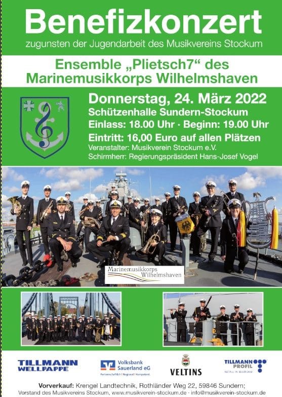 „Es ist schon wirklich etwas Besonderes, ein Marinemusikkorps für ein Konzert in unserer Region begrüßen zu können. Der 24. März 2022 verspricht ein einmaliges Konzerterlebnis zu werden nach einer langen musikalischen Corona-Pause.“, so das Organisationsteam des Musikvereins Stockum. „Nutzen Sie die Chance, Blasmusik auf höchstem Niveau mit dem Ensemble „Plietsch 7“ des Marinemusikkorps Wilhelmshaven am Donnerstag, 24.03.2022 in der Schützenhalle in Sundern-Stockum zu erleben.“