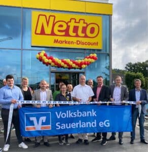 Meschede. Auf dem ca. 5.000 qm großen Grundstück der Volksbank Sauerland im Baugebiet Ziegelei II hat am 25. Juli 2023 ein neuer Netto-Markt seine Türen geöffnet. Auf einer Verkaufsfläche von 799 qm präsentiert der Markt sein Sortiment mit mehr als 5.000 Artikeln. Der Fokus dabei liegt auf Frische, Qualität und vor allem Regionalität. Bauherr und Investor ist die Volksbank Sauerland.