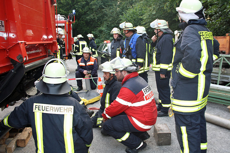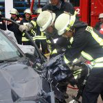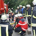 Nun konnte der Pkw gegen ein Abstürzen gesichert, der Patient durch den Rettungsdienst erstversorgt und anschließend mit schwerem technischen Gerät von der Feuerwehr aus seiner Zwangslage befreit werden. Zeitgleich wurde der eingeklemmte Radfahrer vom Rettungsdienst versorgt und mit Hilfe von sogenannten Lufthebekissen, die zum Anheben von schweren Lasten dienen, befreit. „Die beiden Verletzten konnten schnell, sicher und professionell gerettet werden. Damit wurden“, so die zufriedene Übungsleitung, „die richtigen Maßnahmen eingeleitet und alle Übungsziele erreicht“.