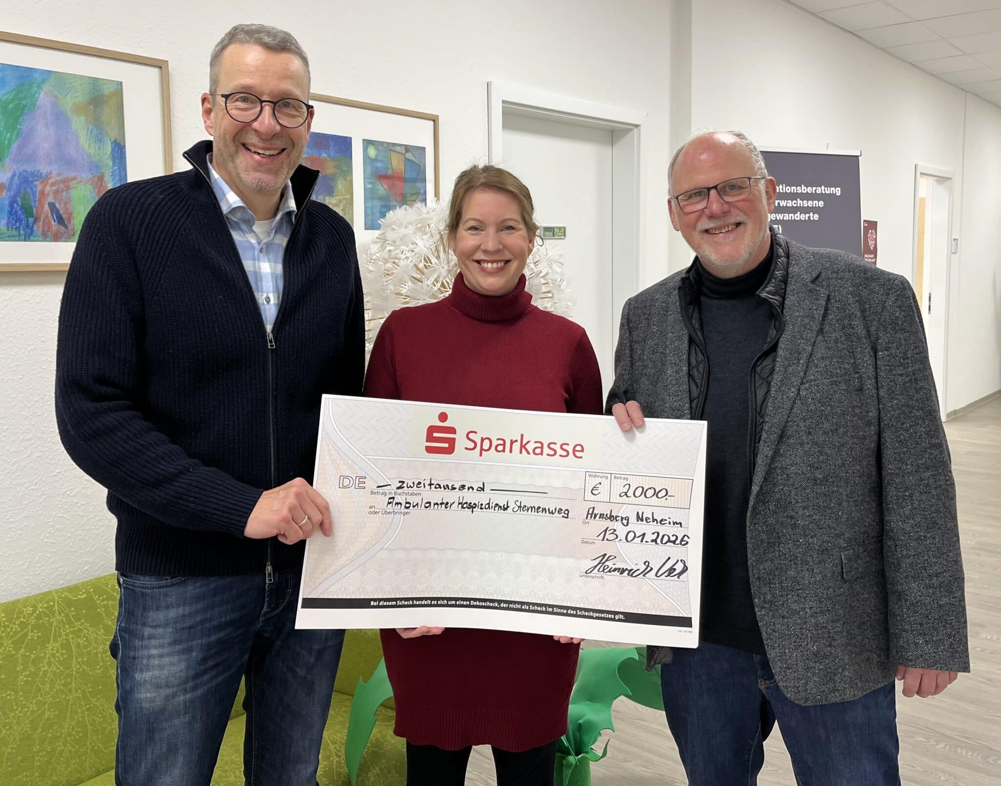 Arnsberg/Neheim. Der Nehei­mer Jäger­ver­ein hat eine Spen­de in Höhe von 2.000 Euro an den Ambu­lan­ten Hos­piz­dienst Ster­nen­weg über­ge­ben. Das Geld stammt aus der Kol­lek­te des Jäger­fest-Got­tes­diens­tes und wur­de vom Ver­ein auf einen glat­ten Betrag aufgerundet.
