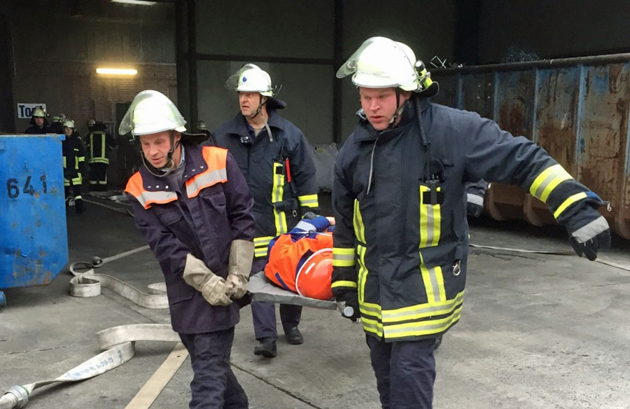 Seitens der Firma Greve Rohre waren die Geschäftsleitung sowie der Sicherheitsbeauftragte bei der Übung anwesend. Außerdem verfolgte die stellvertretende Bürgermeisterin Rosemarie Goldner als Übungsbeobachterin aufmerksam das Geschehen und informierte sich so einmal ganz praktisch über die Tätigkeiten und die Ausrüstung der Feuerwehr, die sie sonst nur aus den Debatten im Rahmen der eher nüchternen Ausschuss- und Ratssitzungen kennt. Hier konnte sie nach einer Fahrt mit der Drehleiter zum Übungsort und geschützt von einer Feuerwehr-Einsatzjacke, den Feuerwehrdienst einmal live erleben und war sichtlich beeindruckt von dem Aufwand, den die Wehrleute regelmäßig in ihre Aus- und Fortbildung investieren. Die Arnsberger Feuerwehr wiederum freut sich über dieses Interesse aus dem politischen Raum und lädt gern weitere Vertreter der Kommunalpolitik ein, sich im Rahmen der Übung ein eigenes Bild über die Arbeit der Brandschützer zu machen.
