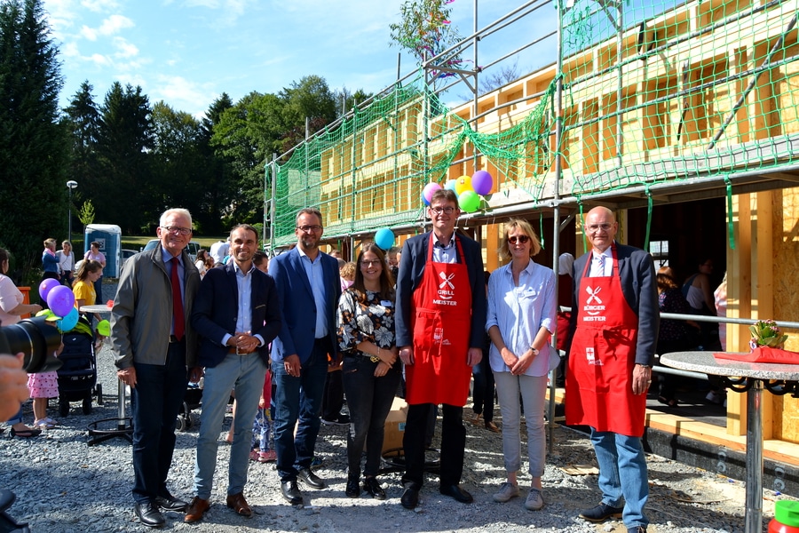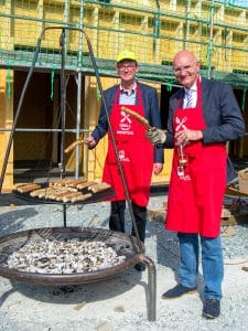 Nach dem traditionellen Richtspruch des Zimmermanns der Hennecke Holzbau GmbH aus Brilon ging es für alle auf Entdeckungstour durch den Rohbau. Für die Besucher gab es viele Räume zu erforschen. In einen Raum wurden Ideen für den Namen der neuen Kita wurden gesammelt, mit kreativen Vorschlägen, und ein gemeinsames Wandbild gestaltet. Christian Stockmann, sozialfachlicher Vorstand und Bürgermeister Brodel lösten auch ihr Versprechen ein und kümmerten sich gemeinsam mit roten Caritas-Schürzen um den Grill und die Würstchen, die bei kalten Getränken ihre Abnehmer fanden. Wenn der Innenausbau ähnlich schnell weitergeht, dürften sich alle Besucher schon bald zur Einweihung wiedersehen.