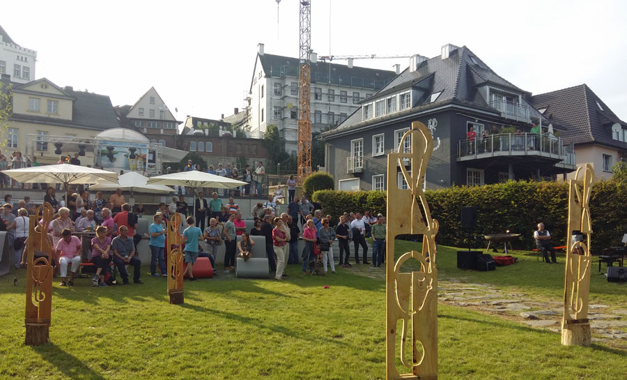 Der Bürgermeister lud die Bürger ein, die Ruhrterrassen intensiv zu nutzen, sei es, um ein wenig innezuhalten und Ruhe zu finden, um einfach nur den sich immer wieder veränderten Fluß zu beobachten oder um miteinander zu kommunizieren oder mit ihren Vereinen dort zu feiern. Dem nahen „La Vita“ dankte er für die Übernahme der gastronomischen Betreuung. Dass die Ruhrterrassen auch hervorragend als neuer Kulturort taugen, stellte das Kunstsommer-Team unter Beweis. Die besucher konnten sich an einigen der in diesen Tagen zahlreichen Tanzvorführungen erfreuen und auch die ausgestellten Holzskulpturen kommen am Flußufer gut zur Geltung.