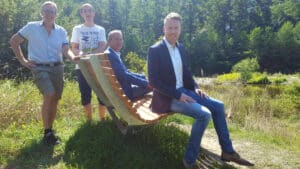Olaf Spindeldreher als INO-Vorstandsvorsitzender bedankte sich herzlich bei dem Erbauer und der LBS für das schöne Geschenk. Alle vier nahmen Platz auf dem Waldsofa und genossen in der Sonne den herrlichen Ausblick auf die renaturierte Ruhr sowie die malerische Oeventroper Landschaft.