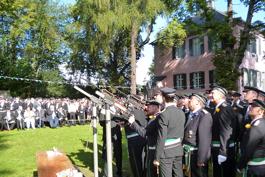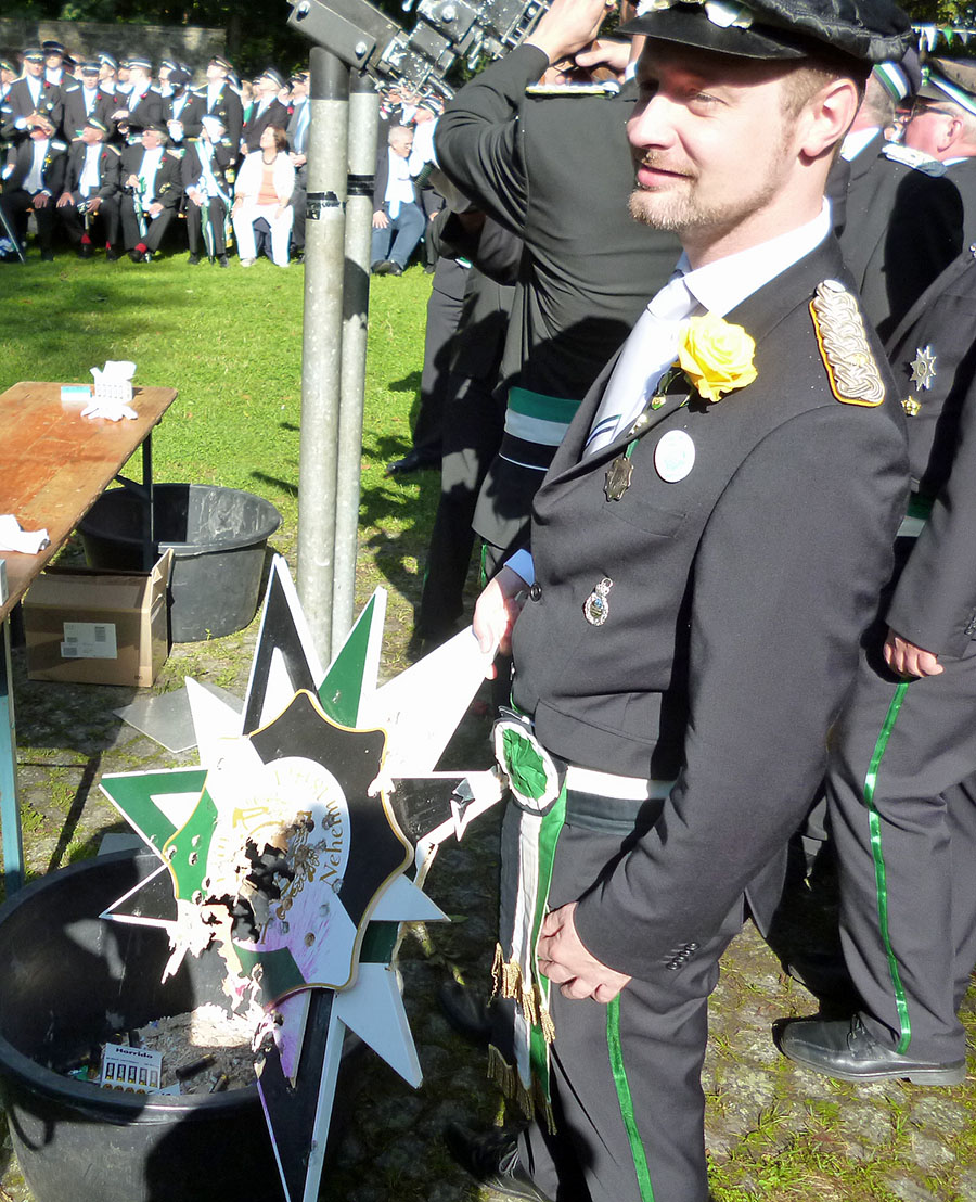 Die Entscheidung um die Nachfolge von Jägerkönig Dr. Gerhard Webers fiel noch vor 10 Uhr und im 176. Schuß. „Wunderbar, dass so viele nette Menschen Jägerkönig werden wollen“, kommentierte Hermann Beilenhoff die große Traube, die sich um die beiden Gewehre unter dem Jägerstern gebildet hatte und in der alle vier Kompanien vertreten waren. Christof Hesse und Rolf Trompeter, Bernd Holthöwer und Dr. Heiner Thalmann, Stephan Giersberg und Uli Schulte waren einige der Kandidaten, die mit Peter Klein wetteiferten. Der hatte bereits mit seinem vorletzten Schuss einen Volltreffer gelandet und den Stern fast komplett abgeschossen. Nur ein Rest der Bodenplatte hing noch auf der Schraube – und blieb auch dort, bis Peter Klein wieder an der Reihe war. „Vor 30 Jahren, als ich das erste Mal mitmarschiert bin!“, antwortete der überglückliche neue Jägerkönig auf die Frage, wann er sich den entschlossen habe, Jägerkönig werden zu wollen. Schließlich kommt er auch aus einer alten Jägerfamilie. Sein Vater Werner Klein war langjähriger Kompanieführer der 2. Kompanie.