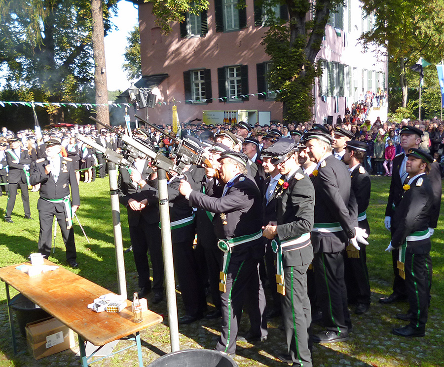 Die Entscheidung um die Nachfolge von Jägerkönig Dr. Gerhard Webers fiel noch vor 10 Uhr und im 176. Schuß. „Wunderbar, dass so viele nette Menschen Jägerkönig werden wollen“, kommentierte Hermann Beilenhoff die große Traube, die sich um die beiden Gewehre unter dem Jägerstern gebildet hatte und in der alle vier Kompanien vertreten waren. Christof Hesse und Rolf Trompeter, Bernd Holthöwer und Dr. Heiner Thalmann, Stephan Giersberg und Uli Schulte waren einige der Kandidaten, die mit Peter Klein wetteiferten. Der hatte bereits mit seinem vorletzten Schuss einen Volltreffer gelandet und den Stern fast komplett abgeschossen. Nur ein Rest der Bodenplatte hing noch auf der Schraube – und blieb auch dort, bis Peter Klein wieder an der Reihe war. „Vor 30 Jahren, als ich das erste Mal mitmarschiert bin!“, antwortete der überglückliche neue Jägerkönig auf die Frage, wann er sich den entschlossen habe, Jägerkönig werden zu wollen. Schließlich kommt er auch aus einer alten Jägerfamilie. Sein Vater Werner Klein war langjähriger Kompanieführer der 2. Kompanie.