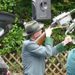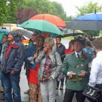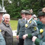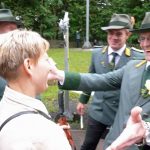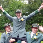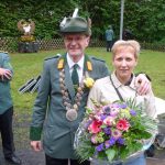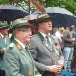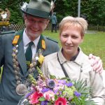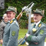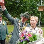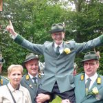 „Das wird heu­te kein Son­nen­kö­nig,“ hieß es schon beim Anmarsch zur Wen­ni­g­lo­her Vogel­stan­ge, denn dunk­le Wol­ken lagen über dem Berg­dorf und just beim Ehren­schuss der schei­den­den Köni­gin muss­ten die Schir­me geöff­net wer­den. Peter Krä­mer und Leo Her­mes scher­te das Wet­ter aber wenig. Die bei­den Nach­barn von der Ennert hat­ten sich schnell als Kan­di­da­ten her­aus­kris­tal­li­siert und nah­men den von Vogel­bau­er Peter Blu­me in inno­va­ti­ver Flach­bau­wei­se aus einer Span­plat­te gefer­tig­ten Vogel kon­zen­triert unter Beschuss. Eini­ge Beob­ach­ter unk­ten schon, die im Kugel­fang auf­ge­mal­te 30 sei eine Pro­gno­se, wie­viel Schuss der Vogel höchs­tens aus­hält. Doch die Zahl soll­te dar­an erin­nern, dass die neue Wen­ni­g­lo­her Vogel­stan­ge inzwi­schen 30 Jah­re alt ist, und auch der Vogel war deut­lich lang­le­bi­ger. Er fiel im 92. Schuss und um 10.18 Uhr konn­te Peter Krä­mer, der in die­sem Jahr zum ers­ten Mal unter der Vogel­stan­ge stand, jubeln. „Mann, der ist ja leicht,“ kom­men­tier­ten die Schüt­zen­brü­der, die ihn auf die Schul­ter hoben. Der 44-jäh­ri­ge neue König, der als Diplom-Ver­wal­tungs­wirt bei der Bezirks­re­gie­rung arbei­tet, ist vie­len in der Stadt als Pres­se­spre­cher der Arns­ber­ger Feu­er­wehr bekannt. Als Köni­gin wird ihn Ehe­frau Ste­pha­nie durchs Regent­schafts­jahr beglei­ten. Bei­de haben einen Sohn.
