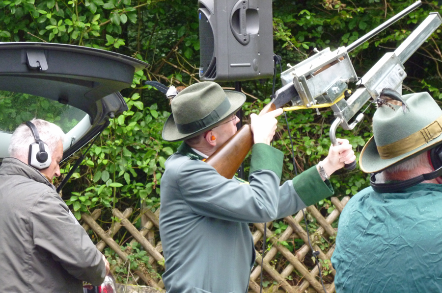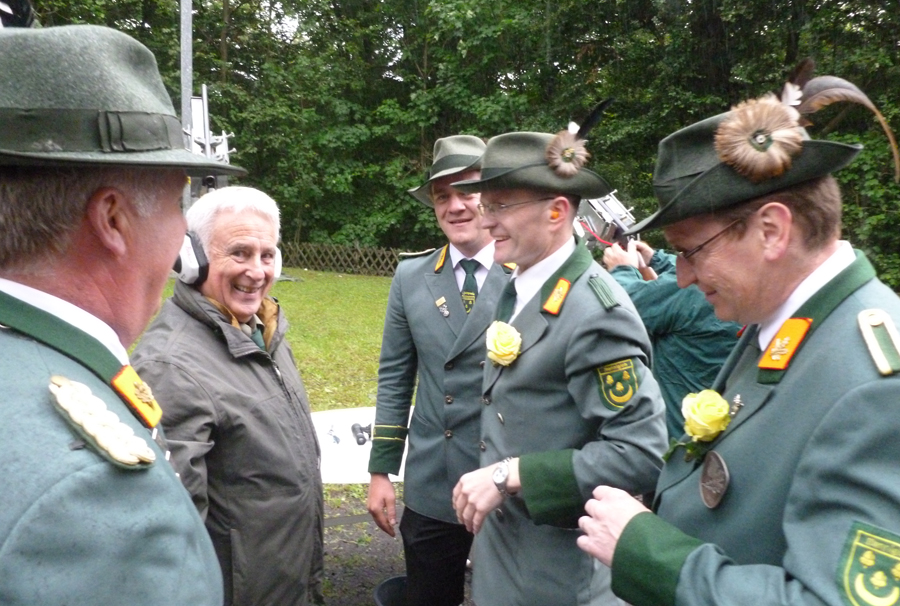 „Das wird heute kein Sonnenkönig,“ hieß es schon beim Anmarsch zur Wennigloher Vogelstange, denn dunkle Wolken lagen über dem Bergdorf und just beim Ehrenschuss der scheidenden Königin mussten die Schirme geöffnet werden. Peter Krämer und Leo Hermes scherte das Wetter aber wenig. Die beiden Nachbarn von der Ennert hatten sich schnell als Kandidaten herauskristallisiert und nahmen den von Vogelbauer Peter Blume in innovativer Flachbauweise aus einer Spanplatte gefertigten Vogel konzentriert unter Beschuss. Einige Beobachter unkten schon, die im Kugelfang aufgemalte 30 sei eine Prognose, wieviel Schuss der Vogel höchstens aushält. Doch die Zahl sollte daran erinnern, dass die neue Wennigloher Vogelstange inzwischen 30 Jahre alt ist, und auch der Vogel war deutlich langlebiger. Er fiel im 92. Schuss und um 10.18 Uhr konnte Peter Krämer, der in diesem Jahr zum ersten Mal unter der Vogelstange stand, jubeln. „Mann, der ist ja leicht,“ kommentierten die Schützenbrüder, die ihn auf die Schulter hoben. Der 44-jährige neue König, der als Diplom-Verwaltungswirt bei der Bezirksregierung arbeitet, ist vielen in der Stadt als Pressesprecher der Arnsberger Feuerwehr bekannt. Als Königin wird ihn Ehefrau Stephanie durchs Regentschaftsjahr begleiten. Beide haben einen Sohn.