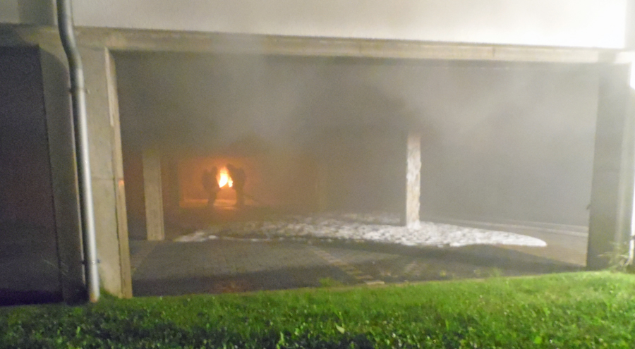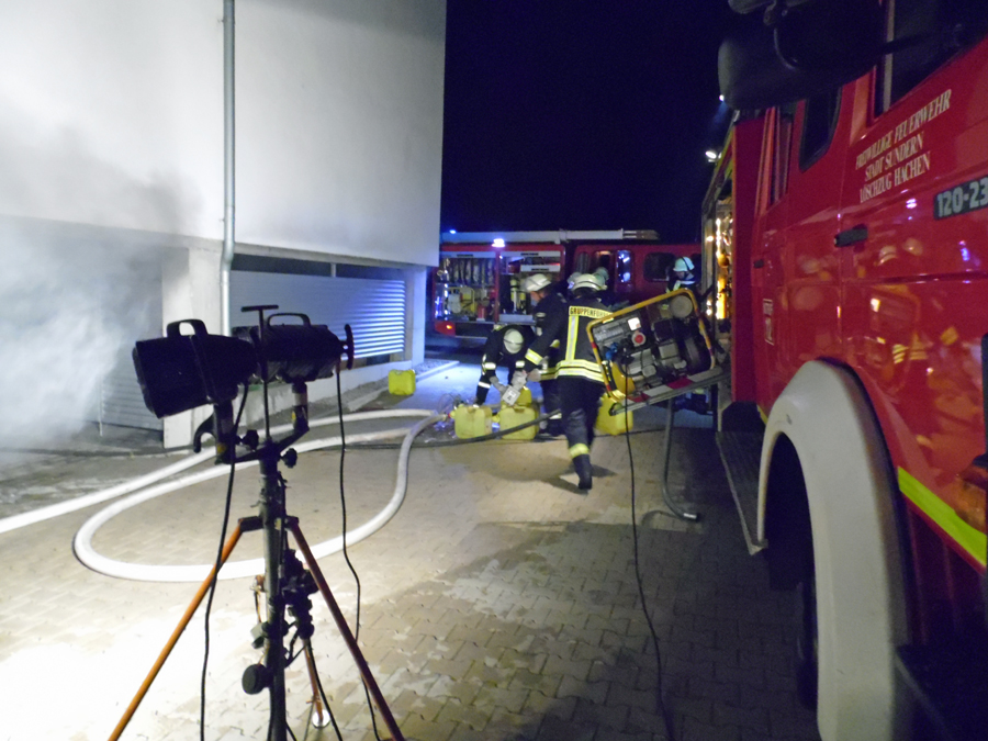 Beim Eintreffen der um 1.56 Uhr alarmierten Löschgruppe Hachen an der Einsatzstelle befand sich das in der Tiefgarage abgestellte Fahrzeug bereits im Vollbrand. In den Wohn- und Gewerbeflächen über der Tiefgarage stellte Einsatzleiter Andreas Becker aus Hachen teilweise eine leichte Verrauchung fest und veranlasste deshalb die Nachalarmierung der Löschgruppen aus Langscheid und Stemel. Zur Brandbekämpfung in der Tiefgarage wurden umgehend mehrere Einsatzkräfte mit Atemschutzgeräten eingesetzt. Der Brand konnte schließlich – nachdem noch Schwerschaum als Löschmittel eingesetzt wurde – schnell unter Kontrolle gebracht werden. Das Wohn- und Geschäftshaus wurde zwischenzeitlich durch Einsatzkräfte der Feuerwehr vorsichtshalber evakuiert. Die Nachlösch- und Aufräumarbeiten dauerten noch rund eine halbe Stunde. Die Bewohner konnten kurzfristig in ihre Wohnungen zurückkehren, da für sie eine Gefährdung nach Kontrolle der Räume ausgeschlossen werden konnte. Insgesamt waren rund 40 Einsatzkräfte vor Ort.
