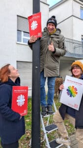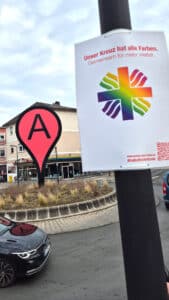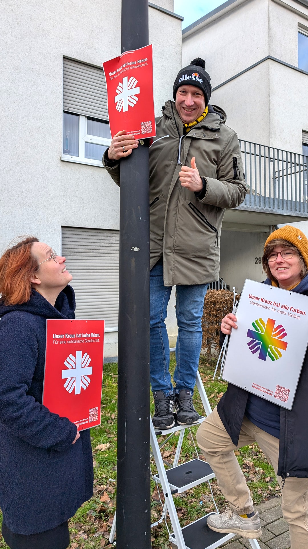 Die Kolleginnen weisen darauf hin, dass es wichtig ist, den rechten Parolen auch im Alltag zu widersprechen. Von daher setzten die Caritas-Bildungseinrichtungen und CaritasHäuser des Verbandes vor ihren Einrichtungen auch mit einer Plakataktion der Caritas-Kampagne „Unser Kreuz hat alle Farben“ bzw. „Unser Kreuz hat keine Haken“ an den Laternen ein starkes Zeichen. Dies ist nur eine von vielen Initiativen des Verbandes, wie Mahnwachen, Beteiligung an den Demos oder der Caritas-Bundeskampagne „Caritas öffnet Türen“, die der Ortsverband aktiv initiiert, mit denen wir die Werte der Caritas – Vielfalt, Demokratie soziale Gerechtigkeit und Nächstenliebe – aktiv stärken wollen.