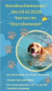 Arnsberg. Nach einer Freibadsaison mit fast 100 Tagen Schwimmen, Chillen und dem Abschlussfestival „Rock im Nest“ gehört das Wasser zum Saisonende ganz den Vierbeinern: Am 3. Oktober 2025 lädt das Freibad Storchennest von 11 bis 16 Uhr zum zweiten Hundeschwimmen ein.